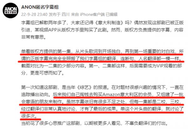 一个典型案例是,2022年,一家已经解散两年的字幕组上线维权。据该字幕组微博所述,他们原创翻译的一部小语种剧集的字幕,被正版版权方抄袭。