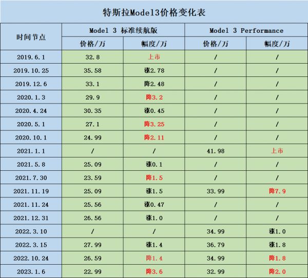 从2016年上市到2022年,特斯拉一直在努力降低Model 3的生产成本,并且已经做到至少30%的降本幅度。2019年上市时,Model 3的起步售价是32.8万元,最贵的时候要卖到35.58万元,最低时候只要22.99万元。到如今的23.19万元,Model 3的起步价格已经降低了近10万元。