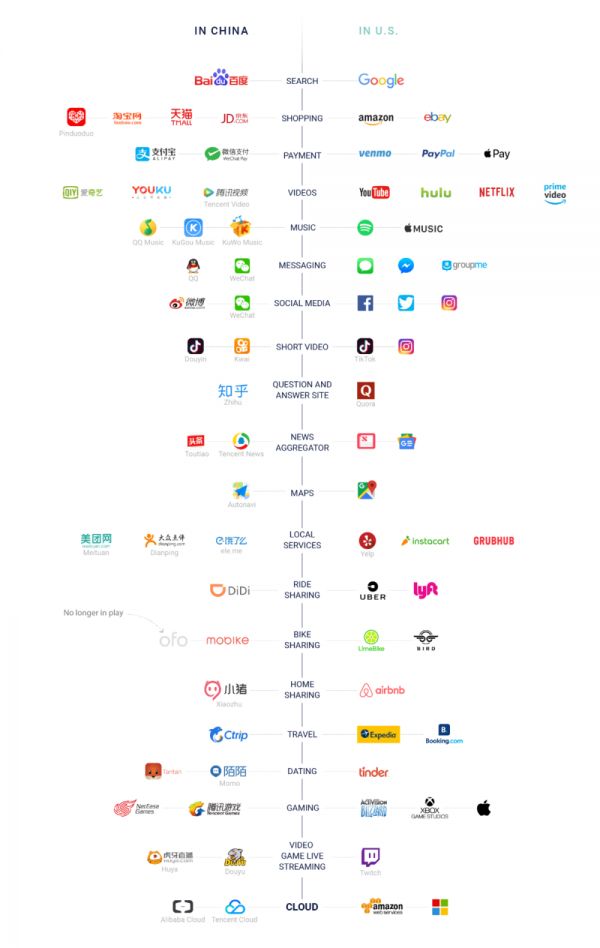 例如,中国的互联网产业,本质上是与美国形成了“双操作系统”模式,美国有Facebook,中国有腾讯,美国有亚马逊,中国有阿里巴巴,美国有谷歌,中国有百度,美国有Uber,中国有滴滴打车……