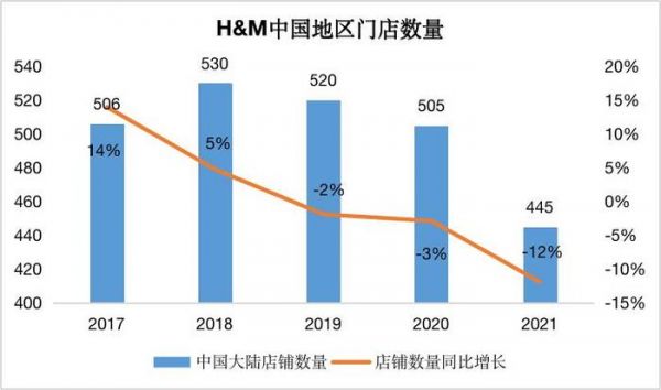 H&M 财报显示,2019 年开始,H&M 在中国的门店数量就开始缩减,2019 年至 2021 年,H&M 中国门店数分别为 520 家、505 家和 445 家,连续三年出现门店数量同比下降的情况,且下降比例不断扩大,从 2019 年的 2% 扩大至 2021 年的 12%。