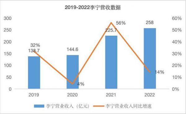 数据来源:H&M财报积极投入咖啡和快闪店布局的李宁,财务数据也并不好看。2021 年,短暂剥离了疫情的影响后,触底反弹的李宁在当年实现 225.7 亿元营收,同比增长 56%。然而,到了 2022 年,其增速明显放缓至 14%,是近四年除了疫情爆发当年以外,增速最慢的一年。
