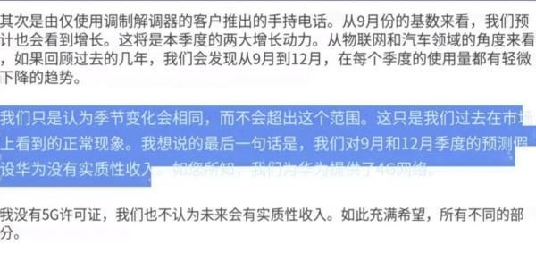 在该UP主于今年8月9日发布的视频中,其从高通8月3日发布的第三季度财报会议中发现了一个非常炸裂的消息。在高通发布的报告中有一段专门提到了华为。高通表示,“我们只是认为季节变化会相同,而不会超出这个范围。这只是我们过去在上看到的正常现象。我想说的最后一句话是,我们对9月和12月季度的预测假设华为没有实质性收入,如你所知,我们为华为提供4G芯片。”