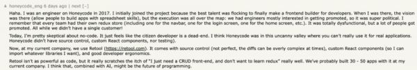 Hacker News 上的一位评论者 Honeycode_eng 自称是“2017 年负责过 Honeycode 项目的工程师”,他表示: