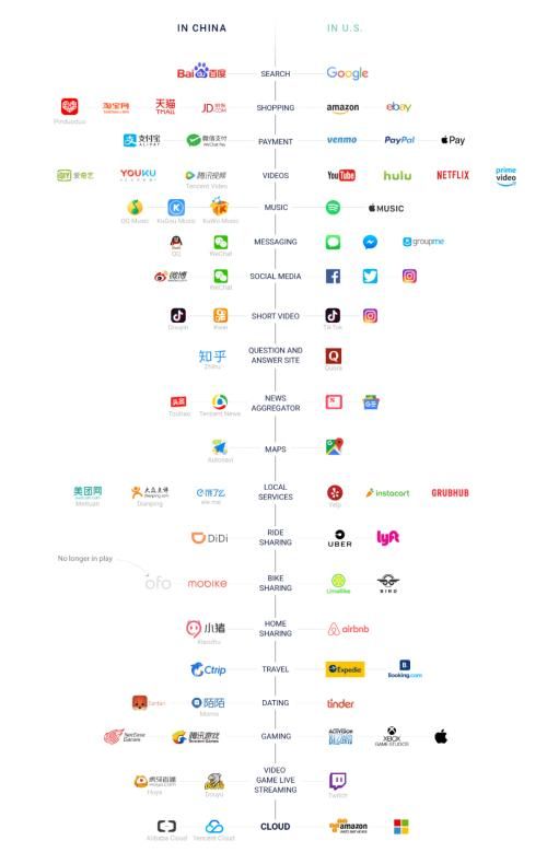 例如,中国的互联网产业,本质上是与美国形成了“双操作系统”模式,美国有Facebook,中国有腾讯,美国有亚马逊,中国有阿里巴巴,美国有谷歌,中国有百度,美国有Uber,中国有滴滴打车……实际上,互联网产业的中美双操作系统模式,就有很特殊的时代背景,首先互联网这个产业太特殊,中国对于外资互联网公司有着很严格的限制,例如Facebook、谷歌在华业务有诸多限制,这给了本土的腾讯、百度等公司巨大的市场空间,经过20年的发展,中国的互联网产业毫无疑问具有了世界级竞争力,在全世界仅次于美国,不仅能够很好地服务本国市场,还在海外取得了一定的成就。