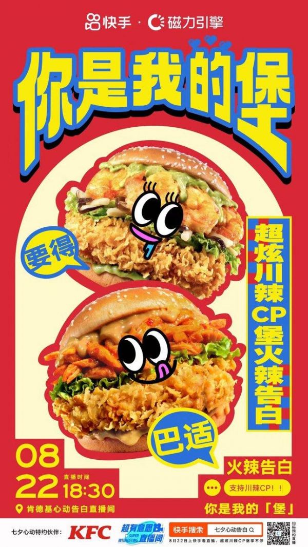 快手超有意思直播间作为集“创意主题+超强互动+明星达人+资源助推”为一体的整合营销,特别企划“快手七夕心动告白直播”,携手“七夕心动特约伙伴”肯德基以热辣炸场。