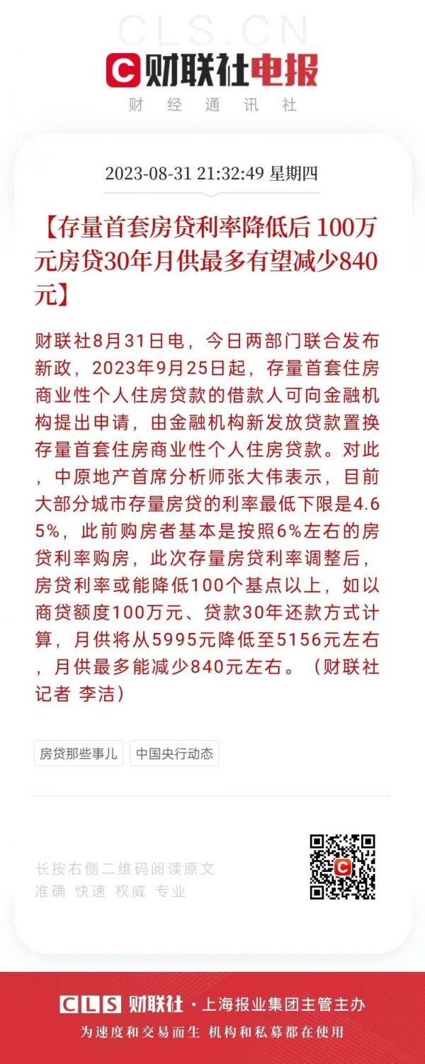 8月31日中国人民银行、国家金融监督管理总局联合下发《关于降低存量首套住房贷款利率有关事项的通知》: