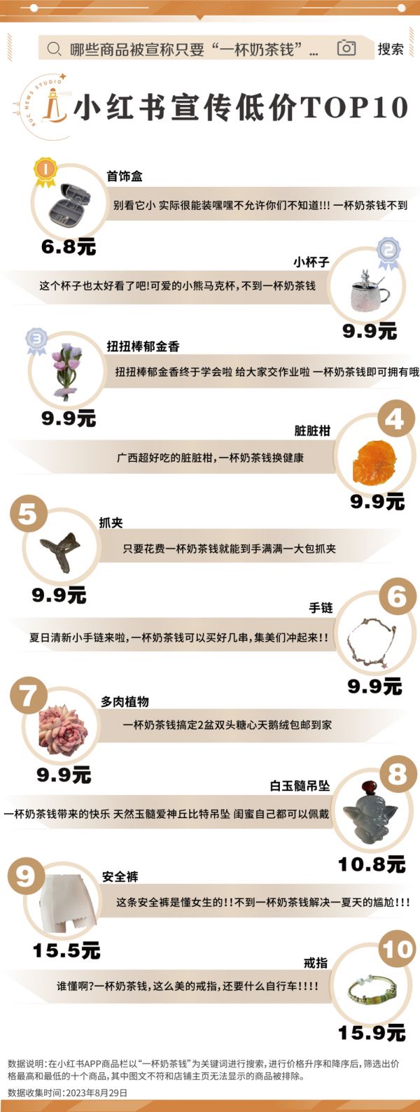 首先,号称用“一杯奶茶钱”就能买到的东西单价往往不高,不用咬牙跺脚,随手就能带一件。小红书商城6.8元的首饰盒,9.9元的小熊马克杯,微信公众号的广告推送中3.9元的脱毛膏,8.8元的单次公交卡……与古早十元店中的小商品高度重合。