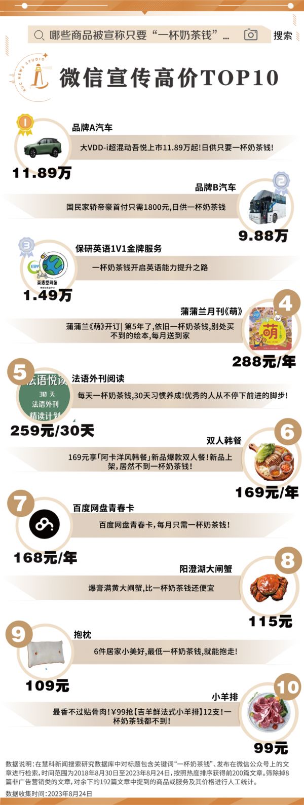 其中也不乏“大件”,比如微信搜索中11.89万、9.88万元的汽车,各类价格不菲的课程、年卡等。这时,“一杯奶茶”便十分自然地成为日供或均摊到每一天的费用——无论你是否有每天喝奶茶的习惯。