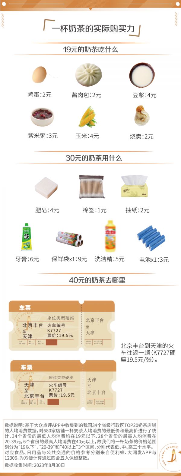 它真的“便宜”吗?不妨来看看一杯奶茶钱的购买力:19元,足够在便利店买上六个品种的早点,在超市买上一堆必须的日用品,也可以买两张京津之间的硬座火车票。