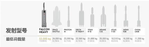 搭载了27个“梅林”发动机的重型猎鹰火箭平台能够将大约2,000吨的负载送上天空,相当于一个高一英里(约1.6公里)、1100辆汽车高的堆叠物。重型猎鹰火箭于2016年首次发射,它将能够运载超过世界上任何其他火箭的两倍以上的有效载荷,并以历史上每磅有效载荷最低的价格进行运载(联合发射联盟(ULA)的收费是重型猎鹰火箭的三倍,并且有效载荷不到一半)。以下是行业中,各家最重型火箭的一些有效载荷比较: