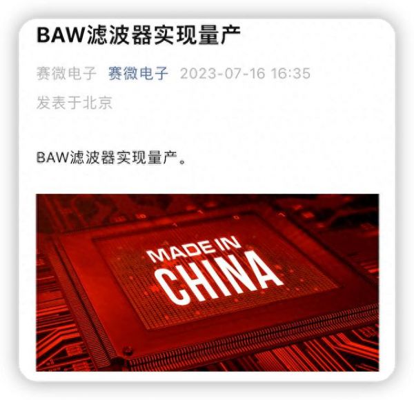 2023年7月,赛微电子宣布,BAW滤波器实现量产,代表我国攻克5G高端滤波器这一组件,实现对射频前端技术的全覆盖。