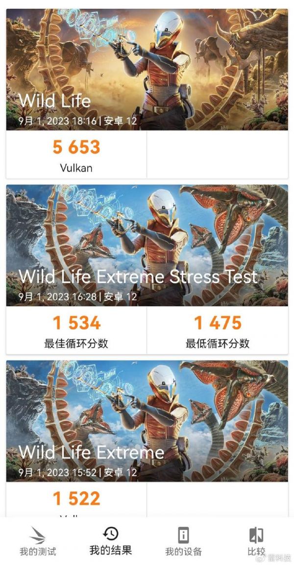 3D Mark测试中,麒麟9000s在Wild Life与Wild Life Extreme测试中得分5653和1522,这也是现阶段为数不多能在华为Mate 60 Pro上“正常运行”的图形测试。