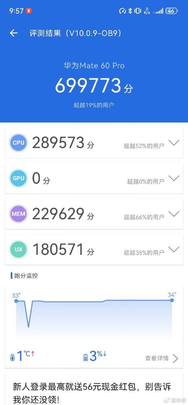 安兔兔测试中,由于测试软件当前还未支持Mate 60 Pro的马良910,所以GPU环节未能获得测试分数,CPU单项得分289573。
