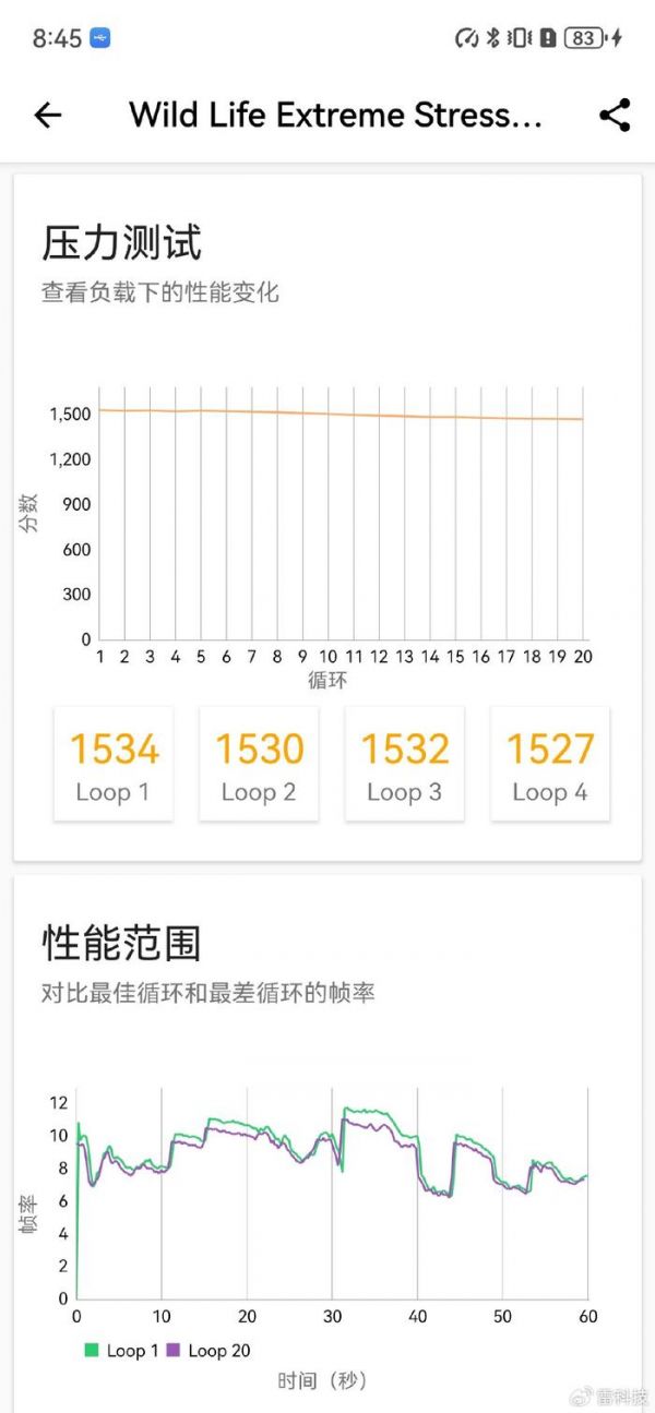 和之前测试散热背夹时一样,小雷采用3D Mark Extreme 压力测试来分析华为Mate 60 Pro的发热与性能释放问题。可以看到单次测试与第一轮测试中,Mate 60 Pro得分为1530分左右。平心而论,这个分数并不高。