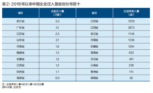 如何评价某地区的招商引资水平?《财经》区域经济与产业研究院以当地的“企业迁入量”和“企业净流入量(即:总迁入量-总迁出量)”为标准,根据企查查发布的数据,梳理了2018年以来企业迁入量和净流入量排序,前十名的省份见表2。