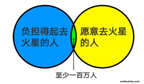 马斯克估计,一张前往火星的票价可能是50万美元,这可能是使蓝色圆圈足够大,以至于绿色区域能够容纳一百万人的关键数字。