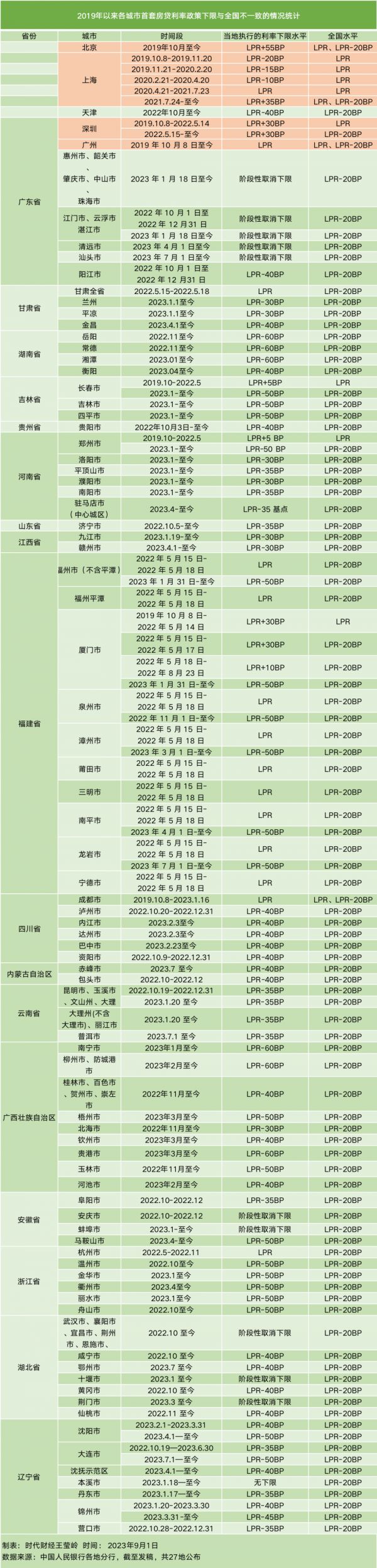 如天津2022年10月至今的利率下限为LPR-40BP,福建厦门2023年1月31日至今的利率下限为LPR-50BP,更有湖南岳阳、常德、湘潭、广西南宁、柳州等地的利率下限为LPR-60BP,为全国最低。