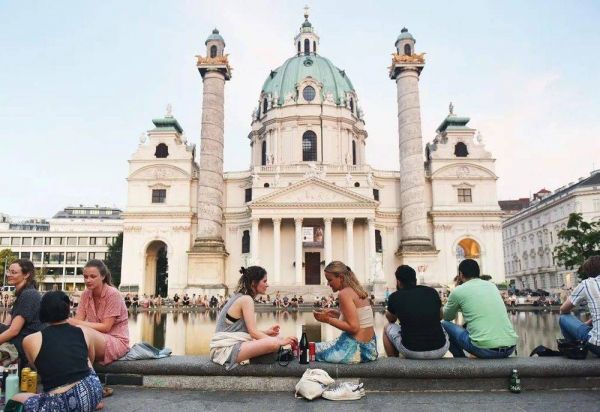 6月20日,游客在维也纳查理教堂前休憩 贺灿玲摄/环球杂志