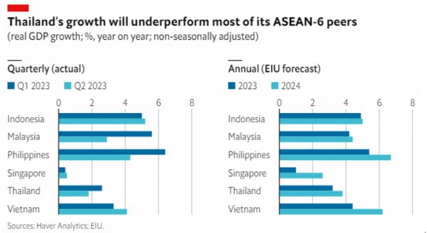 为此,泰国经济与社会发展委员会已下调2023年GDP增长预期至2.5%~3%。相比其他东盟主要经济体,泰国上半年的经济增长率与2023、2024年的全年增长预期仅高于已为发达国家的新加坡。