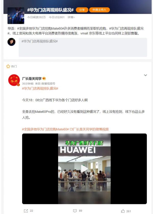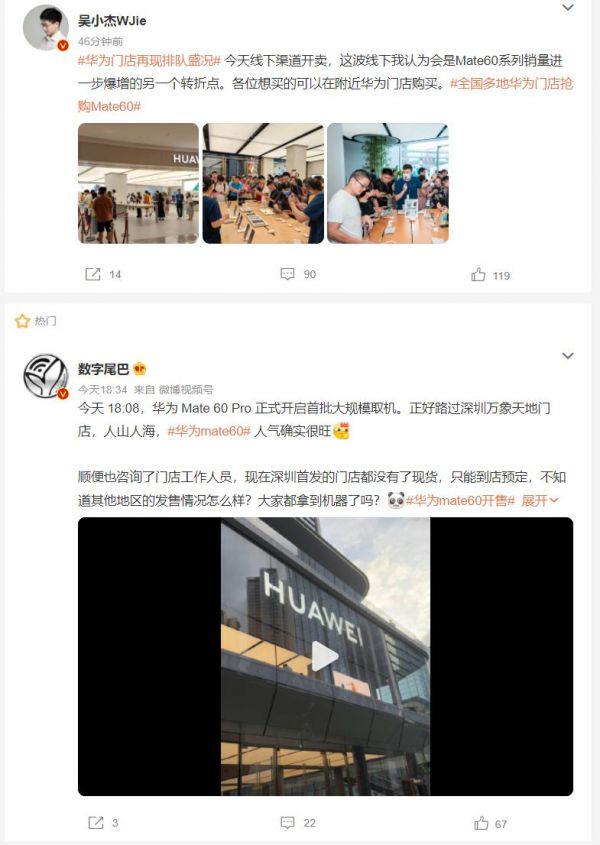目前,根据微博网友爆料,全国多地华为门店抢购Mate60,许多消费者蜂拥而至取机抢购,华为门店再现排队盛况,线上官网和各大电商平台消费者热情持续高涨,vmall 京东等线上平台也同样上架即售罄。