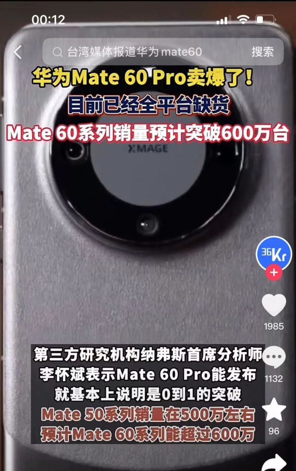 但是华为成功了。开售几天来,华为mate60的销售势头火爆,全平台出现了短暂的缺货状态。