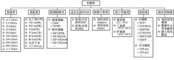 按传输距离可分为几十米/100 m/500 m/2 km/10 km/40 km/80 km/几百千米/≥1 000 km等,按调制格式可分为强度调制(NRZ/PAM4)、相位调制(DP-QPSK/DP-n QAM);