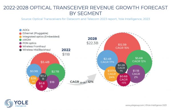 2022年~2028年光收发器全球市场预测,图源丨Yole
