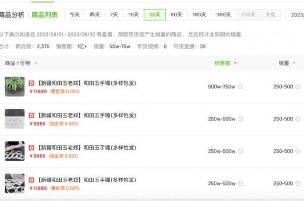 这些真实的“原始”操作反而更易获得中老年女性的信任,虽然老郑给自己立的人设是把玉石做到平民价,短视频也多用几十块钱的玉来引流,但飞瓜数据显示,近一个月,销售额最高的商品为售价1198元的和田玉青圆条手镯(多样性发),直播销量200~500个,销售额为750W。