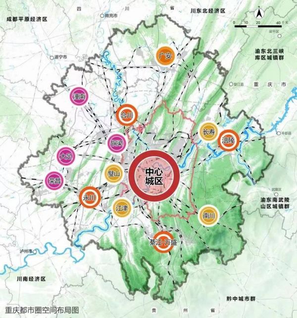 同样,同为跨省都市圈的重庆都市圈,虽说将四川广安市纳入其中,但其自身的36个区县并未全在其列,只有主城都市区21区名列其中。