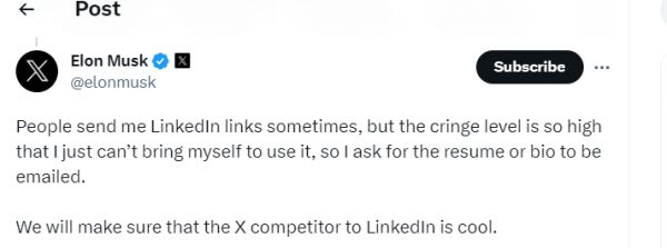 其实,马斯克还有其他计划。他近期宣布,将推出一个与LinkedIn竞争的平台。他形容LinkedIn为“令人尴尬”,而X的版本则会很“酷”。这解释了为什么X会开始收集用户的工作和教育信息。此外,一些经认证的组织已经开始在平台上发布职位信息,而X也计划进一步开放这一功能。马斯克早在5月就暗示过这一点,并随后收购了一家求职匹配的科技公司Laski。
