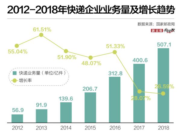 从2012-2018年,短短五年时间,我国快递业务量扩大8倍不止,从56.9亿达到507.1亿件。