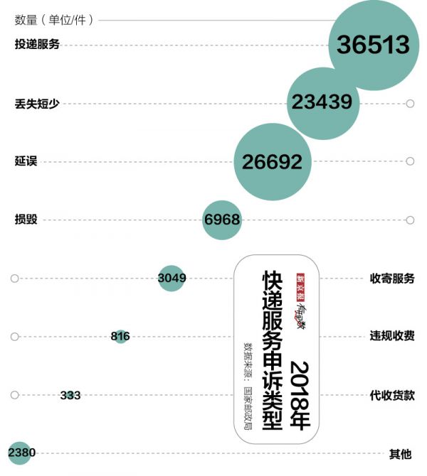 2018年,国家邮政局共收到消费者关于快递服务申诉1946304次,其申诉多集中在投递服务、延误和丢失损毁三大方面。其中投递服务方面数量最多,共36513次。其次,是快递延误问题,被申诉26692次。以及快递丢失短少,共被申诉23439次。