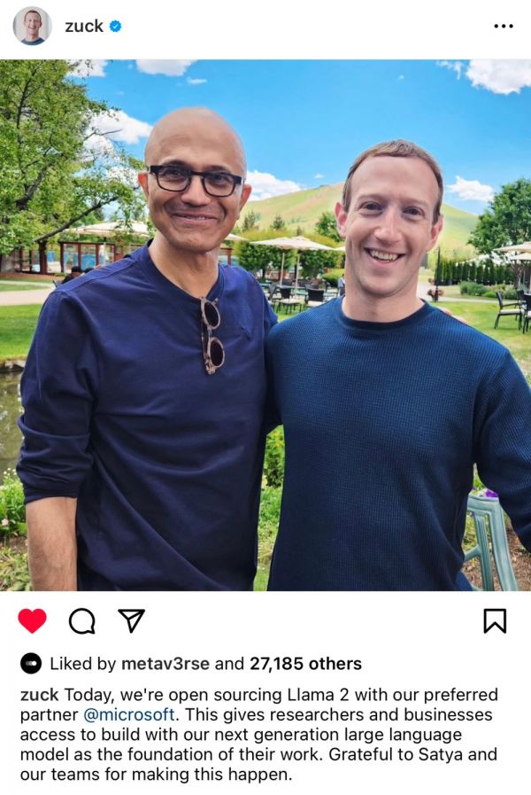 时隔5个月,7月19日,Meta携手微软推出开源大语言模型LLaMA2。发布当天,扎克伯格在Facebook上传了一张和微软CEO萨蒂亚·纳德拉的合照。照片中二人面带微笑,甜蜜相拥,背后蓝天白云、绿草茵茵,一派祥和。有网友调侃道:“我想知道OpenAI感觉如何?”