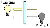 在左侧的房间里面,光线非常强,而右侧的光则非常弱。由于镜子的半透半反作用,两边房间发出的光都会有一半透射到对面房间,而另一半则被镜子反射回来。对光亮的房间来说,反射回来的光线更抢眼,镜子就只是镜子;但对昏暗的房间里,对面过来的光线更抢眼,反射的不算啥,所以镜子就成了玻璃。