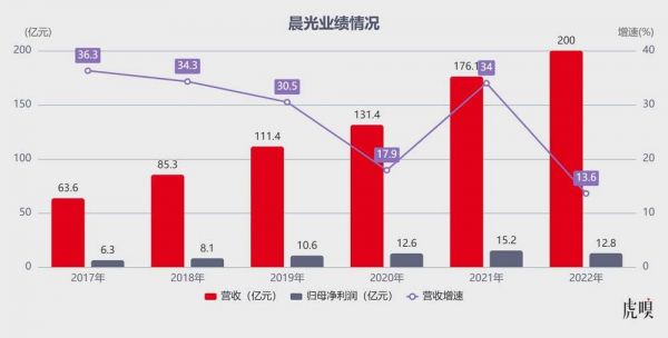 受行业环境影响,晨光文具近年来增速有所放缓。2017年到2019年,其营收从63.6亿元增长到了111.4亿元,复合增长率达32%;2020年到2022年,晨光文具营收从131.4亿元增至200亿元,复合增长率跌至23%。