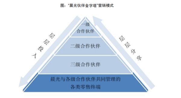 渠道体系方面,晨光没有采用大多数传统消费品公司自己培养区域经理,再由区域经理找销售渠道的路子,而是在文具行业首创了“层层投入、层层分享”的“伙伴金字塔”模式,简言之就是公司在某个区域内只发展一个一级分销商,再由分销商去一级级开拓下游经销商、零售店;每一级的分销商、经销商都独享授权区域的收益。