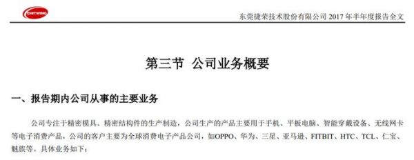 捷荣技术的主营业务是精密模具和精密结构件的生产和销售,2022年其精密结构件产品收入占比超90%。更重要的是,在公司2017年的财报中曾显示,公司客户主要为全球消费电子产品公司,比如OPPO、华为、三星、HTC、TCL、魅族等。