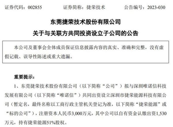 同日,捷荣技术还公告,拟与维信诺(002387.sz)共同出资设立捷荣能源,注册资本3000万,其中公司自有资金认缴出资1530万,持股捷荣能源51%,标的公司的主营业务为新型储能业务的集成、生产和销售,推进公司向储能行业转型发展。