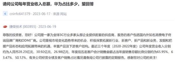 今年6月17日有投资者在捷荣技术互动平台询问,华为营收占比多少?公司只是简单列举了一下近三年前五大客户的收入占比情况,并没有明确告知投资者华为收入占比到底有多少。