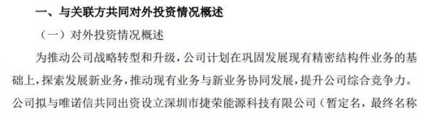 按照捷荣技术在公告中的说法,投资设立捷荣能源主要是为了推动公司战略转型和升级,在巩固发展现有精密结构件业务的基础上,探索发展新业务,推动现有业务与新业务协同发展。