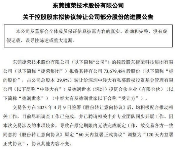 9月1日捷荣技术发布的股价异动公告显示,控股股东拟将7367.94万股、占公司总股本的29.9%转让给深圳中经大有私募及深圳德润世家,交易各方在2023年4月9日、6月8日和8月7日分别签署了《股份转让意向协议》等协议,交易各方一致同意原定签署正式协议期限调整为“180天内签署正式协议”,协议其他内容不变。