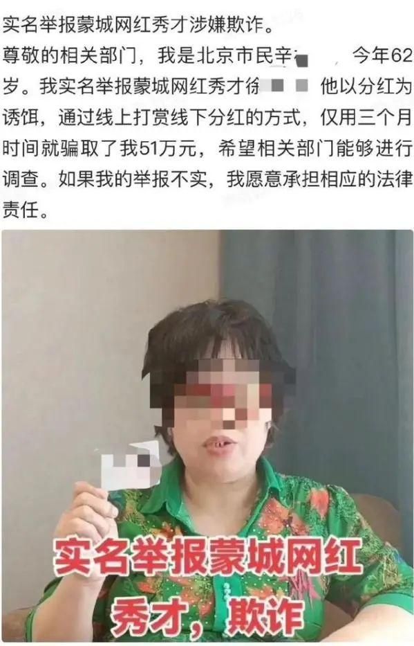 另据九派新闻,此前有网友举报“秀才”涉嫌欺诈。一名来自北京的62岁女性在网上称自己实名举报秀才,以分红为诱饵,通过线上打赏线下分红的方式,用三个月时间骗取了自己51万元。