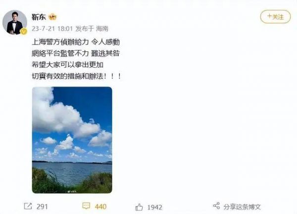 对此,靳东本人回应称:“上海警方侦办给力,令人感动。网络平台监管不力,难逃其咎。希望大家可以拿出更加切实有效的措施和办法!!!”