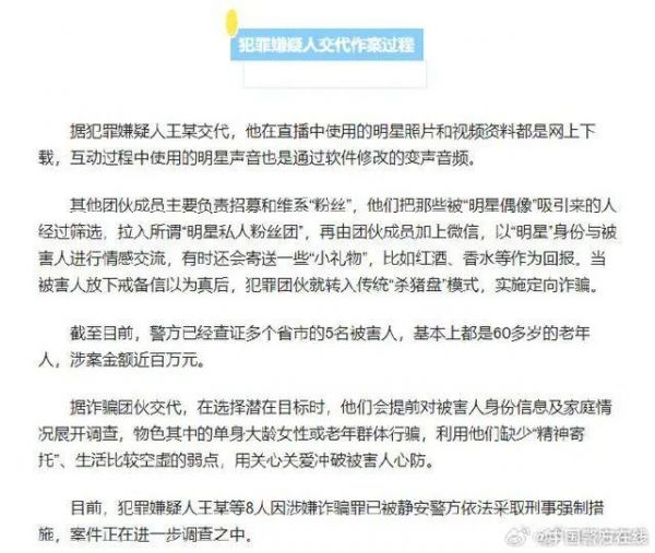 今年5月至7月,上海静安警方赴多省市开展“假靳东”诈骗团伙收网行动,先后抓获王某等成员8人。这个以王某为首的犯罪团伙通过虚构名人、明星身份,邀请粉丝加入各种“粉丝团”“应援团”,从“进团”到“直播互动”到加微信“私密聊天”,一步步诱导被害人与“明星”建立情感联系,再以“投资、公益、应援、恋爱”等各种理由索要钱款。犯罪团伙编造的明星身份除了影视艺人,还包括金融大咖、业界翘楚等。目前,犯罪嫌疑人王某等8人因涉嫌诈骗罪已被静安警方依法采取刑事强制措施,案件正在进一步调查之中。