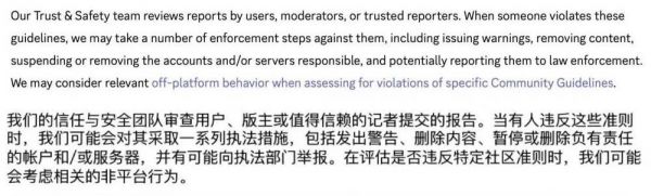Discord 的信任与安全团队,负责检查用户、版主或记者的报告,如果有人确实违反了社区准则,那就发出警告、删除内容、关停账号等,存在一定的被动性。