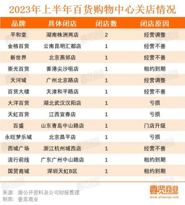 据壹览商业不完全统计,上半年百货购物中心共关闭了 14 家门店,涉及 13 个品牌,其中闭店原因主要为经营不善、亏损、租约到期,其中经营不善为绝大部分闭店品牌闭店的主要原因。