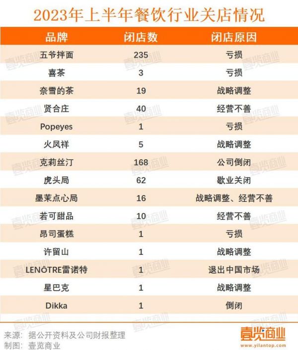 据壹览商业不完全统计餐饮行业闭店达 564 家,共有 15 个品牌发生闭店,其中闭店最多的为五爷拌面,闭店原因主要为亏损与门店调整。今年上半年明星餐饮、国潮点心成为了闭店趋势。