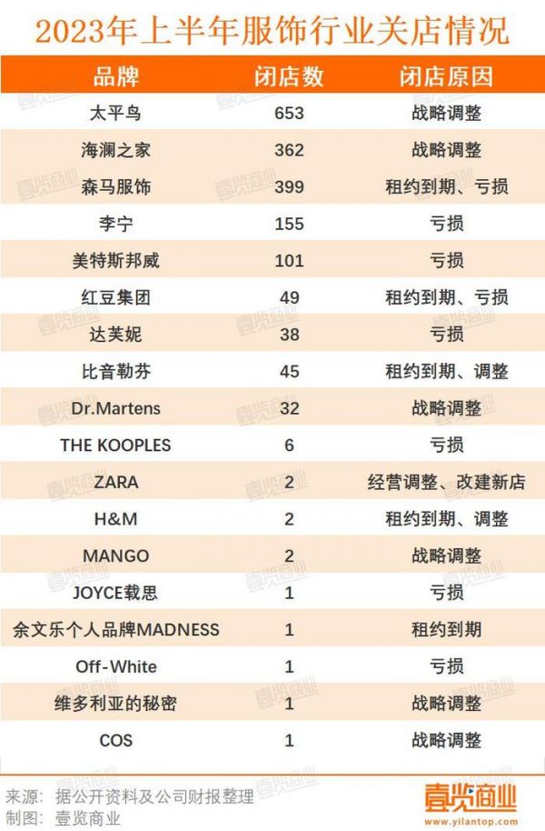 除了国内品牌,国外快时尚品牌的门店数量也在下降,ZARA 关闭门店 2 家、H&M 关闭门店 2 家。