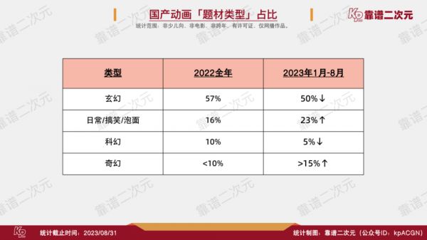 总体上看,作品题材的丰富度上升了,说明各家动画公司也都在试着进行新内容的探索。玄幻动画的比例稳定在50%左右,较2022年全年的57%有所下降;日常搞笑泡面的比例上升至23%,2022年全年的比例是16%,其中有多部作品是新团队创作,说明该类型的入行门槛较低,成本也较低。今年的科幻作品比较稀有了,国漫的第一波科幻潮已结束且无人生还。奇幻类型的作品数量有明显上涨,成为第三大类型作品。奇幻类型的界定比较复杂,包括西方玄幻、都市传奇、架空穿越等设定,包括一定比例的玄幻和日常内容,说明国产动画行业在内容类型的创新上任重道远,想短期内有颠覆式的突破比较困难。
