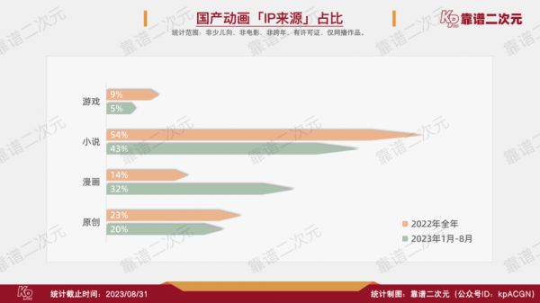 今年开播的作品中,有20%的原创作品、32%的漫画改编作品、43%的小说改编作品,另有4部游戏改编作品。相比2022年,今年小说改编作品的比例有所下降,漫画改编的作品比例翻倍,原创产出稳定。一方面是小说改编作品跨年番趋势明显,新上线数量有所下降,另一方面是漫画改编动画相关作品从腾讯动漫IP拓宽到快看漫画、bilibili漫画、小明太极、新漫画等平台的连载IP,丰富度有所提高。游戏改编动画数量下降,除了王者荣耀、bilibili和网易系游戏,中小厂商对游戏改动画的兴趣归零了。